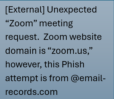[External] Tag – If you receive an email from someone that you know or recognize from RPI, however, the email you received was tagged as [External], this would most likely be a Phishing attempt email and should be cause for concern.